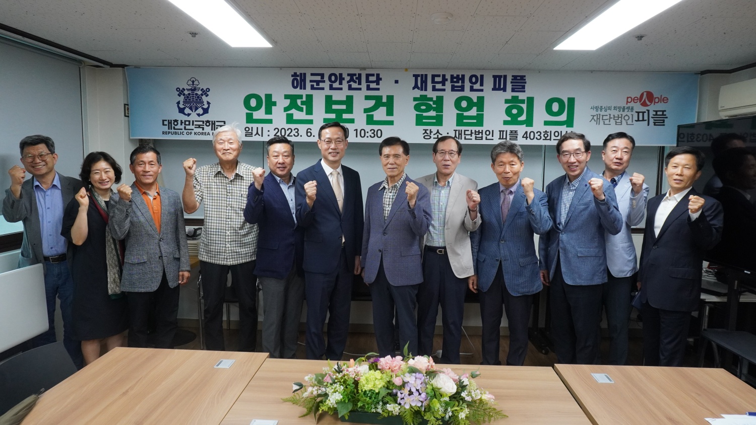 해군안전단 김기재 단장을 비롯한 3인이 영등포 법인을 방문했습니다. 이영순 이사장을 비롯하여 오정일 군 안전보건연구센터장, 김태옥 원장, 임영섭 원장, 박천수 본부장, 송미경 상임이사 등이 참석하여 군 안전보건 관련 다양한 협력 방안을 논의했습니다.